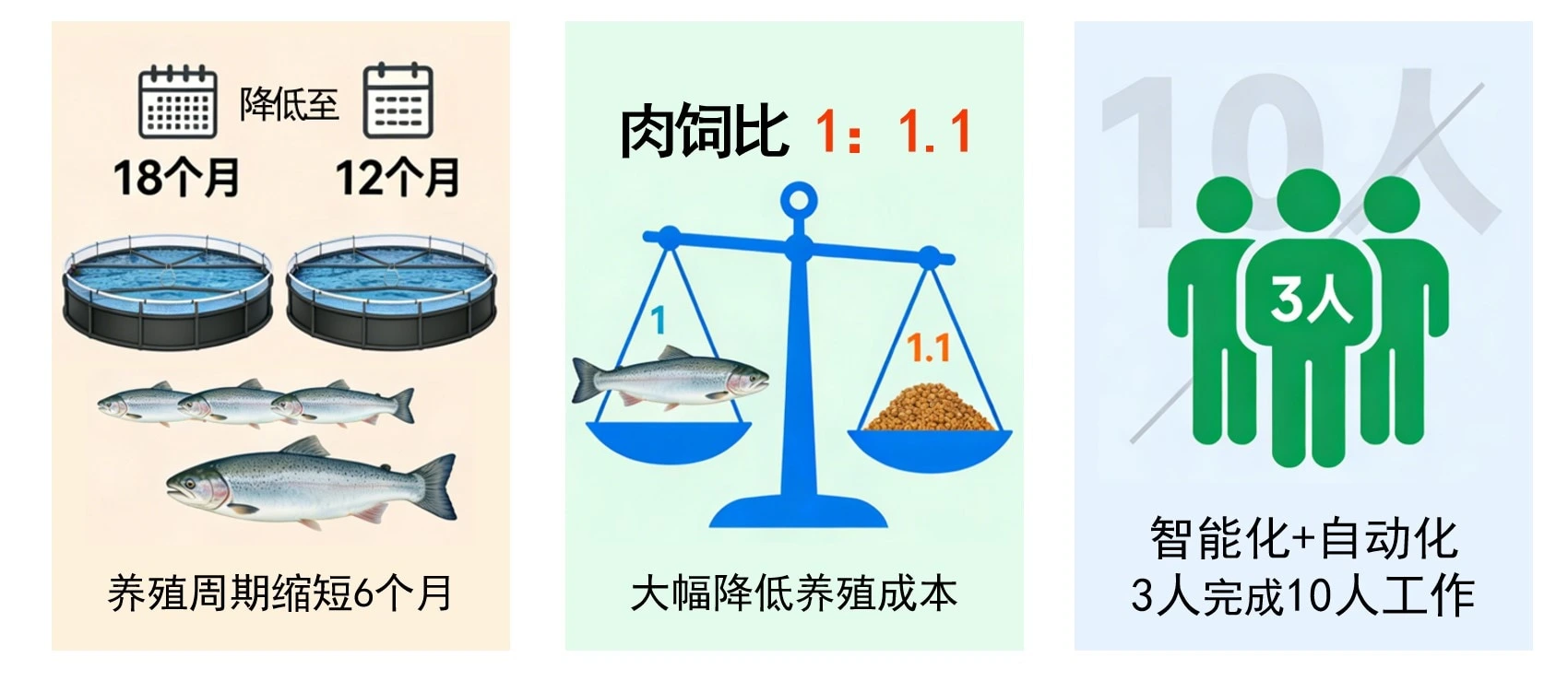 在智能化系统的全面赋能下,养殖生产效率实现跨越式提升。以三文鱼养殖为例,通过建立30余种鱼类养殖全周期数据模型,并利用机器学习优化水温、溶解氧等生长参数,成功将生长周期从传统模式所需的18个月缩短至12个月,生产效率大幅提升。