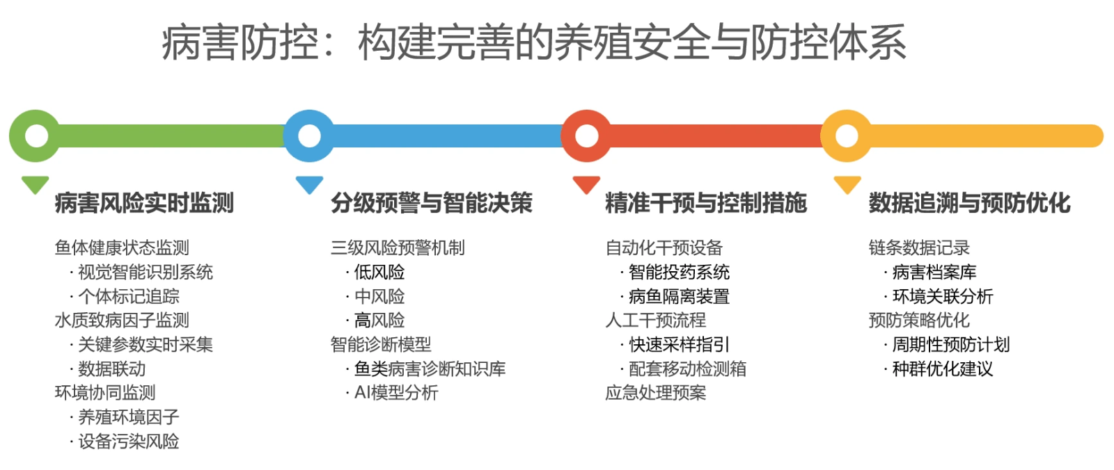 病害防控,是国渔绿色渔业工厂智能管理体系的“健康防护网”,通过“实时监测-分级预警-精准干预-数据追溯”的全流程闭环管理,实现鱼类病害的“早发现、早预防、早控制”。